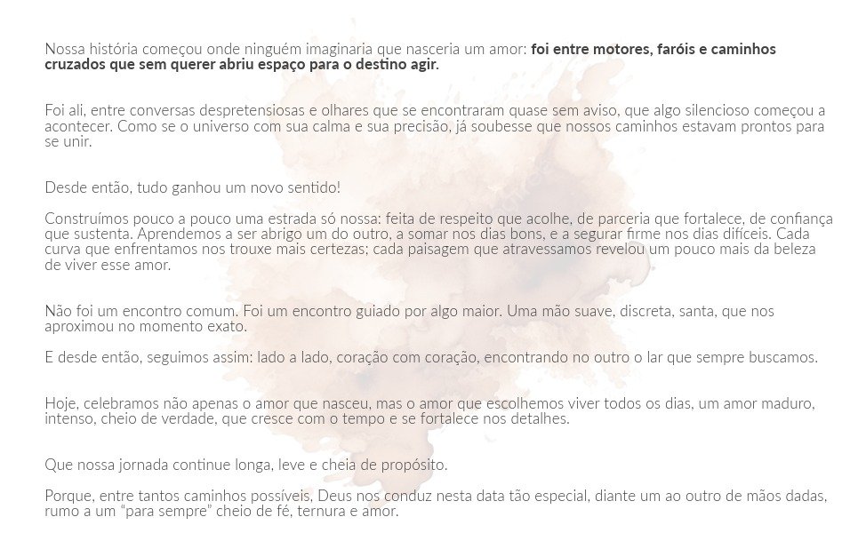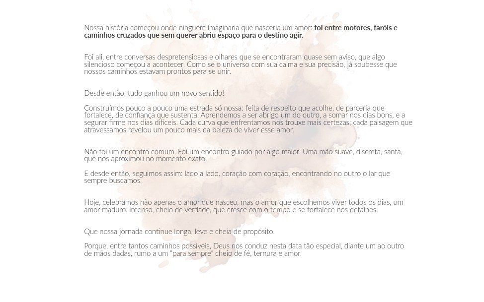 Sua presença na cerimônia religiosa do nosso casamento será essencial para tornar este momento ainda mais especial e abençoado.